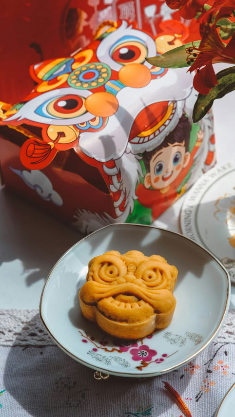 In the late evening of the Moon Festival, a colorful box sat at the back of a small shop in Chinatown. On the box was a picture of a cartoon lion’s head with a boy inside. Next to it, a lion mooncake sat on a small porcelain plate.